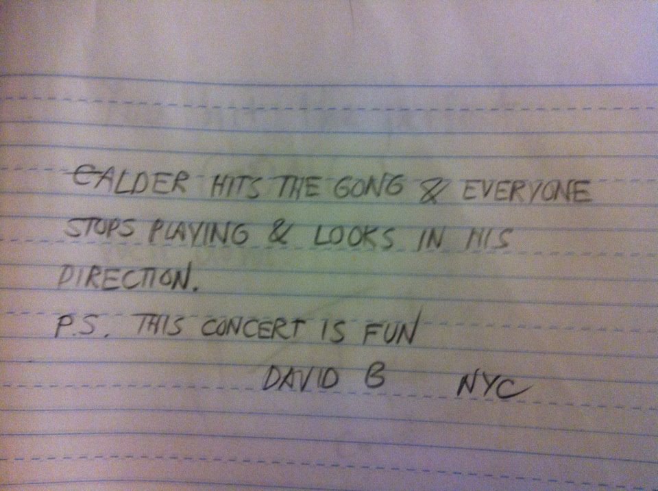 The concert featured most of the same vocalists as the album (it was too expensive to get Mr. Veloso here from Brazil) along with the Wordless Music Orchestra (NYC) and a gaggle of cohorts from Seattle. The percussion section included Greg Saunier (Deerhoof), Seattle’s Paul Kikuchi, my very own dad, me, and… Calder! That’s right, Calder played NYC with Jherek and David Byrne at 8 years old! Sure, it was for only one gong hit, but boy was it worth the cost of bringing him across the country!